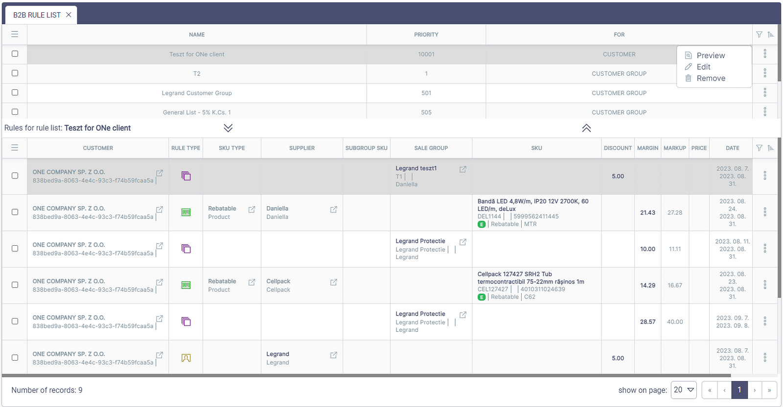 - To manage rule lists or specific rules, click on the action icon ( ) located on the right side of each row. As a Price Manager, you can perform the following actions on rule lists: