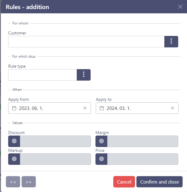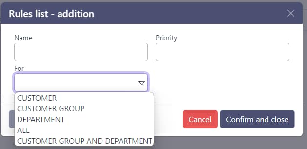 - Depending on the rule list you've selected (for Customer, Customer Group, Department, All), when creating a new rule, you can choose specific values from the dropdown list in the "For" section, such as customers, customer groups, departments, or customer+department.