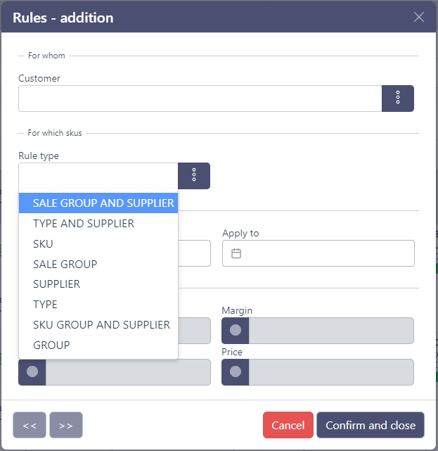- Depending on the rule type you select, choose a specific value in the adjacent field, such as a specific index, sales group, SKU type, supplier, or subgroup.
