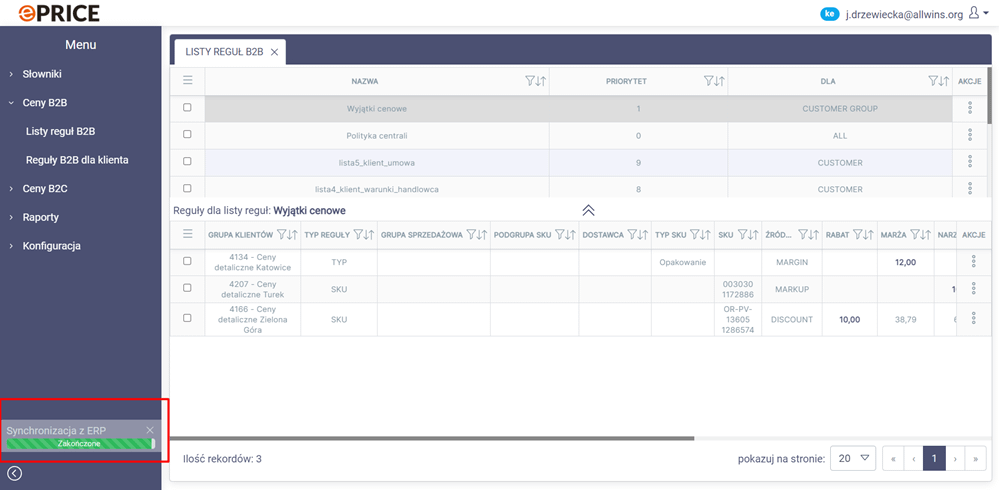 - From the menu in the upper left corner (hamburger menu ) , choose the "Sync with ERP" option. At this moment, ePrice (via integration) sends the entered changes to the ERP on demand and updates the prices. A progress bar for the operation can be seen at the bottom of the screen.