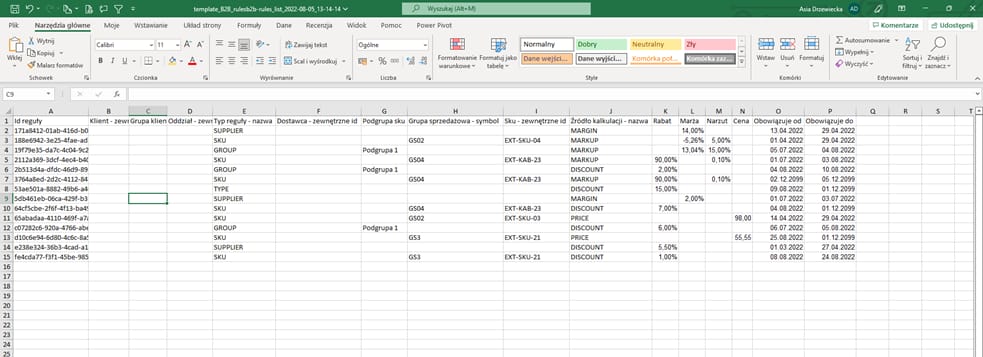 ⚠️ IMPORTANT! If you're adding a new rule, the ID of the rule (column A) must be empty. The import is done through external IDs, so it's important that the appropriate columns are filled with external IDs, both in the import file and in the dictionaries (for "association" to occur).