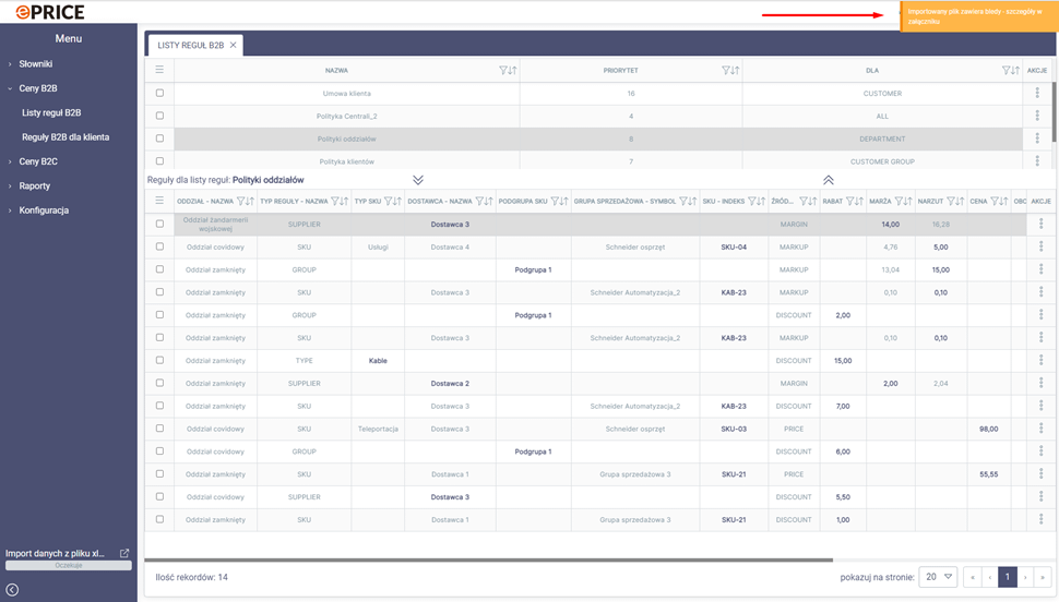 - However, if there are errors during the import, a notification about errors will also appear in the upper right corner. A file containing information about why a particular rule list was not imported is automatically downloaded. You should correct the XLSX file and import it again.