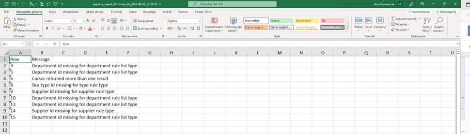 - However, if there are errors during the import, a notification about errors will also appear in the upper right corner. A file containing information about why a particular rule was not imported is automatically downloaded. You should correct the XLSX file and import it again.