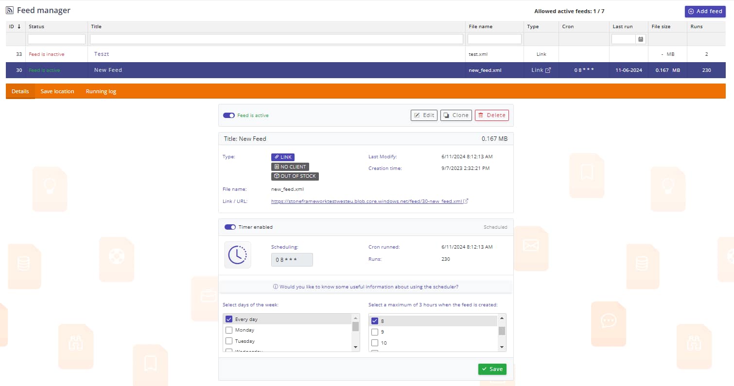 Selecting the Feed manager will display its home page. Here you can see the number of feeds allowed for that Tenant and how many of them they have used.