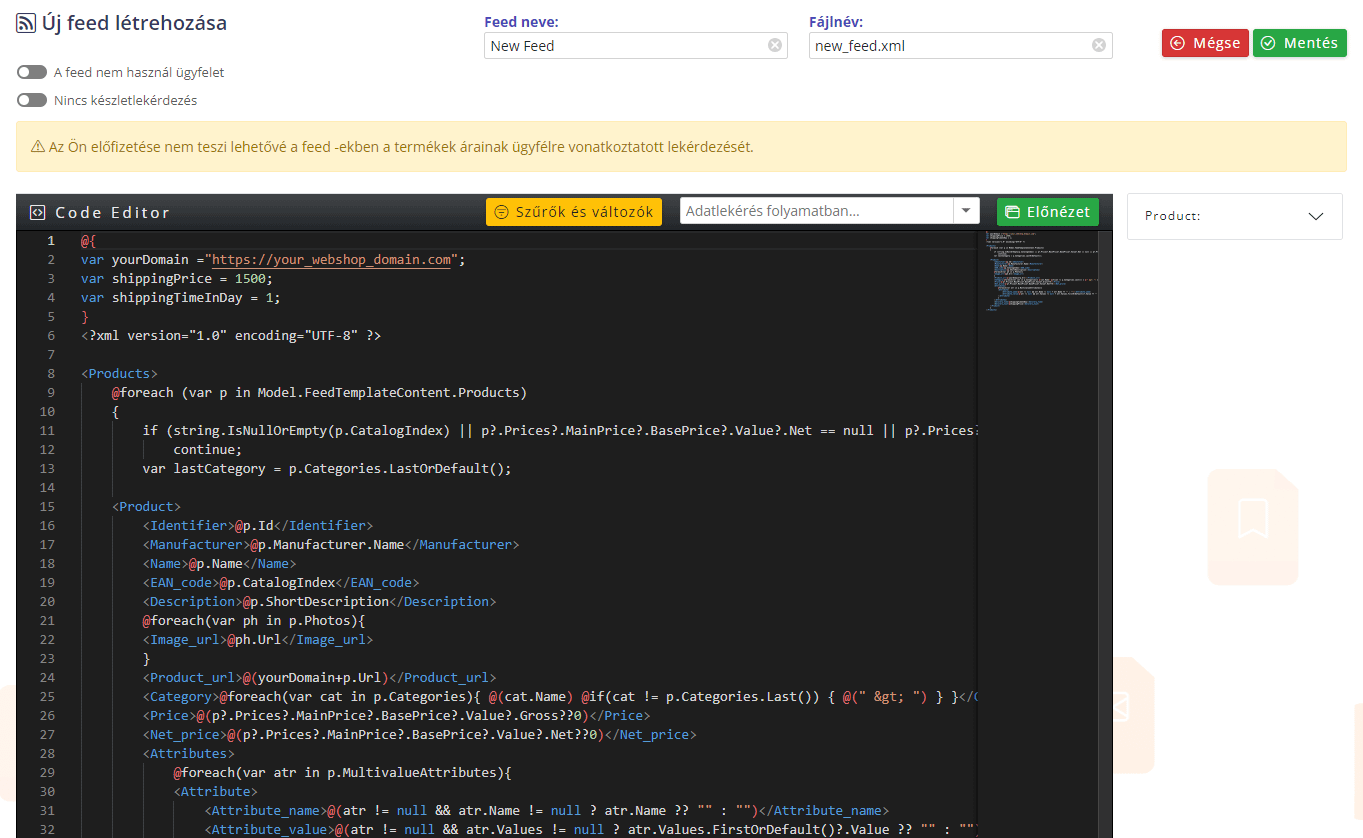 A new feed is created by clicking on the "New feed" button. After pressing the button, a pop-up window will appear where you can select the appropriate template: