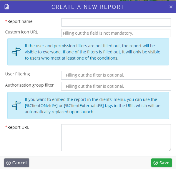 We have the option to embed certain reports, for instance, into the customer menu item. To do this, in the URL of the report (referring to the specific customer), it is necessary to pass either the selected customer's ONe ID or the External ID defined by us during synchronization. In the window for adding a new report, an informational popup assists and explains its operation.